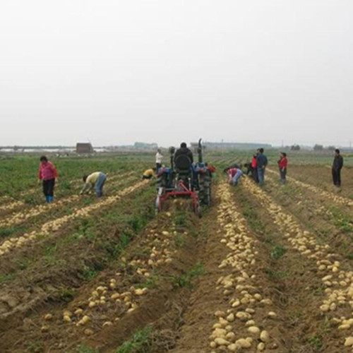 收獲機 地瓜收獲機與小四輪拖拉機傳動軸連接,經(jīng)主傳動軸上偏心塊、連桿帶動挖掘鏟作前后往復(fù)運動,再由傳動軸左端齒輪帶動過橋軸上變速齒輪,并改變傳動方向,再經(jīng)鏈條帶動分離排鏈主傳動軸,并由主傳動軸兩端偏心塊帶動振動篩上下抖動。在拖拉機的牽引下,使挖掘鏟挖掘出來的馬鈴薯(大蒜、地瓜等)鋪放在分離排鏈上,在分離排鏈的轉(zhuǎn)動下土落在分離排鏈下方,馬鈴薯(大蒜、地瓜等)和未落下的土塊,在分離排鏈上面落在振動篩上,再次清選分離后集中鋪放在機后地面上。
